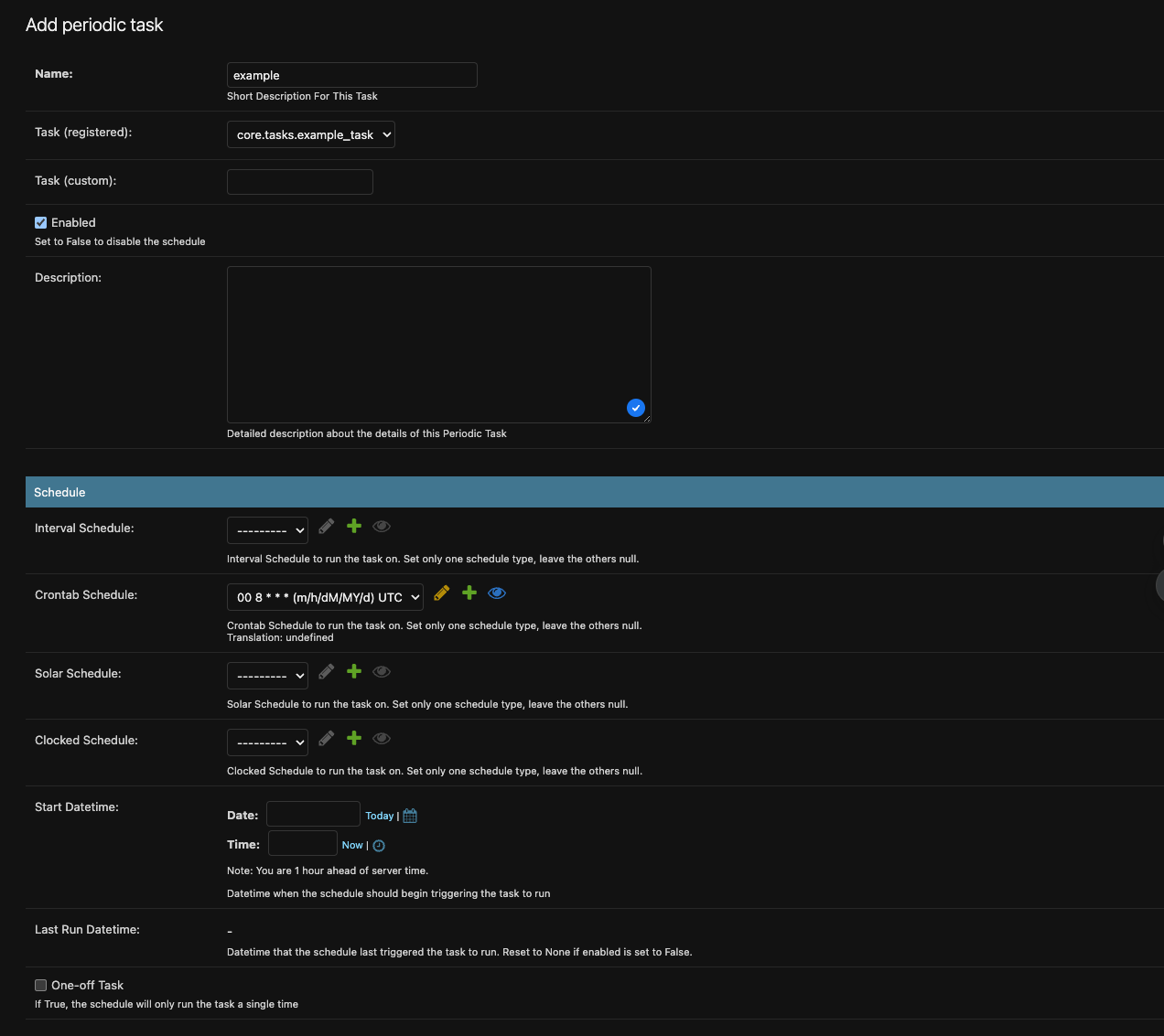 Po instalacji Celery Beat możesz zarządzać okresowymi zadaniami za pomocą panelu administracyjnego Django. Oto przykład:
