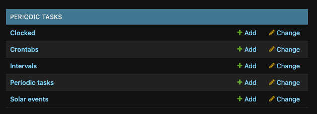 python manage.py migrate django_celery_beatW efekcie w adminie mamy nową sekcje "Periodic Tasks"